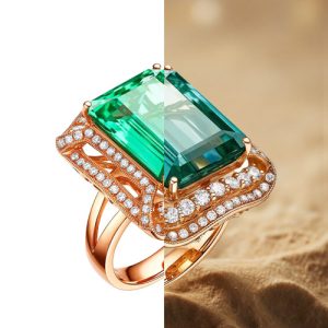 Tongdaovision’s retouching balances precision and storytelling. White – background clarity targets “emerald diamond ring” keywords. Scene