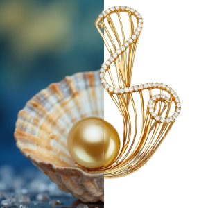 Tongdaovision’s retouching balances precision and creativity. White – background clarity hits “gold pearl brooch” keywords. Scene