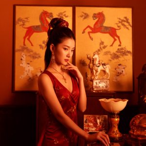Warm lighting, side lighting, and an elegant traditional set are used in photography to highlight Tang