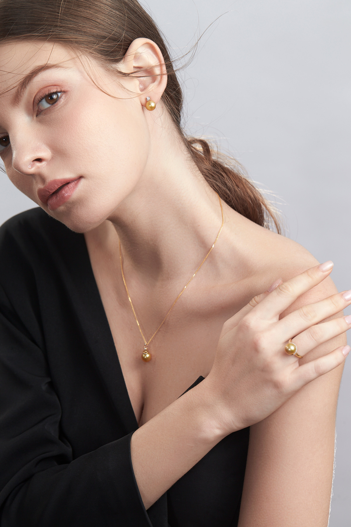 Diverse compositions (close-ups/interactive poses) showcase the jewelry set (necklace/earrings/rings/bracelets). The golden pearl style extends style layers, fitting “light luxury pearl jewelry shooting” keyword.